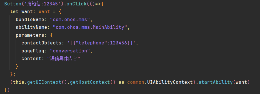 HarmonyOS app快速到发送短信的页面,并填充数据